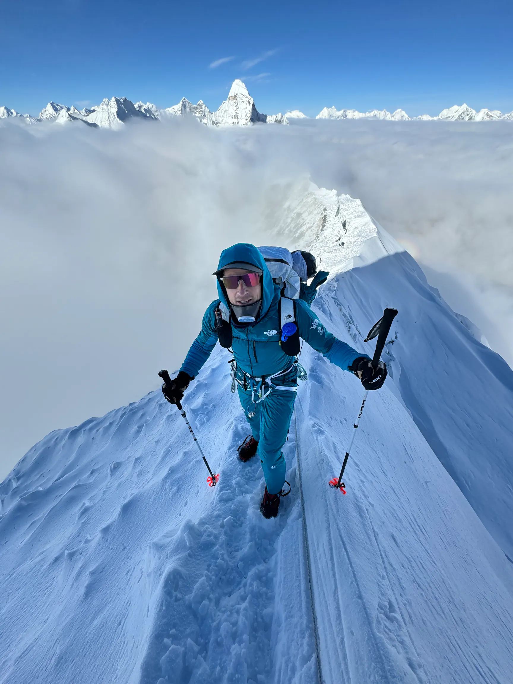 This expedition adds to an impressive list of achievements: with successful ascents of Gasherbrum II, Broad Peak, Dhaulagiri, Lhotse, Makalu and Everest, David has already summited six additional 8000-meter peaks in this uncompromising style.