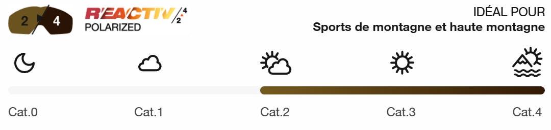 Le verre REACTIV 2-4 s’ajuste automatiquement selon la lumière : il s’éclaircit quand le ciel se couvre (catégorie 2) et s’assombrit fortement sous un soleil intense (catégorie 4).