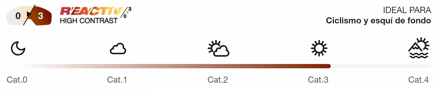 Esta lente se aclara completamente en la oscuridad (categoría 0) y se oscurece a pleno sol (categoría 3).