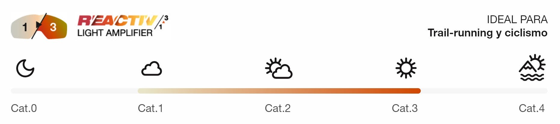 Esta lente se adapta automáticamente a la luminosidad exterior, desde condiciones de baja luz (categoría 1) hasta pleno sol (categoría 3).