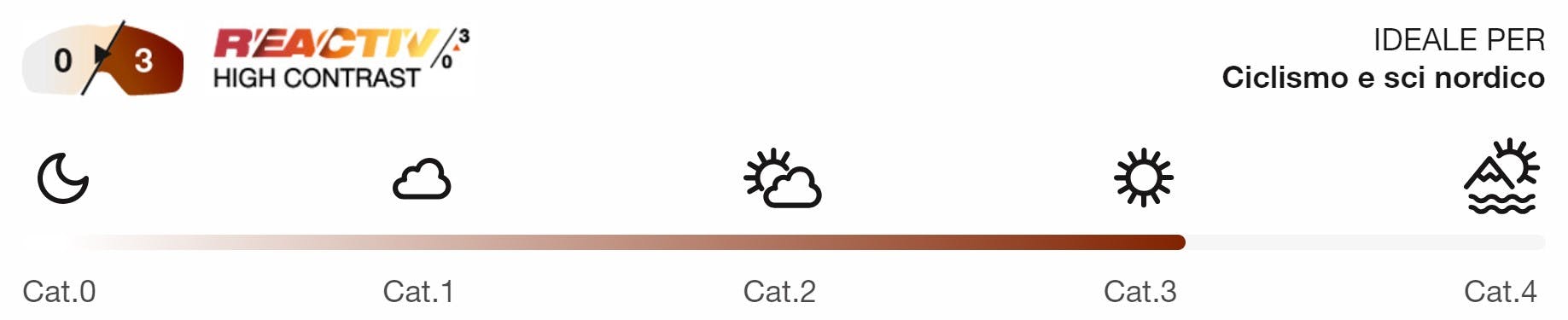 Questa lente si schiarisce completamente al buio (categoria 0) e si scurisce in pieno sole (categoria 3).