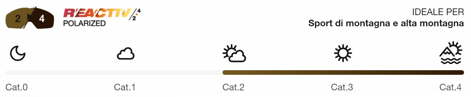Questa lente si adatta automaticamente alla luminosità: si scurisce con sole intenso (categoria 4) e si schiarisce quando il cielo si copre (categoria 2).